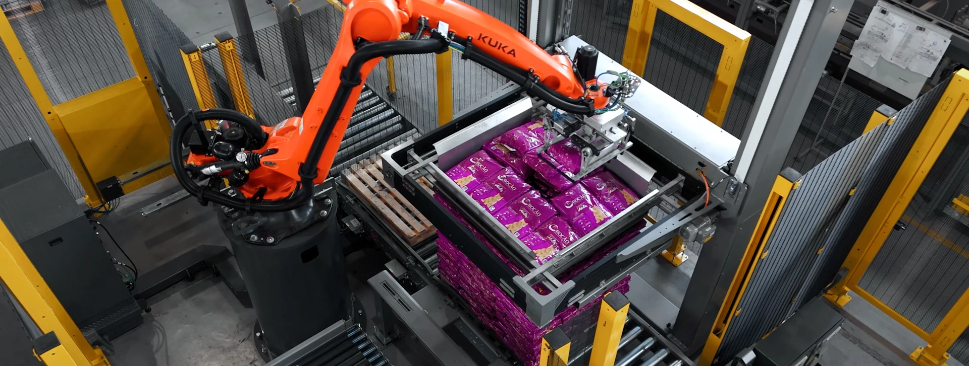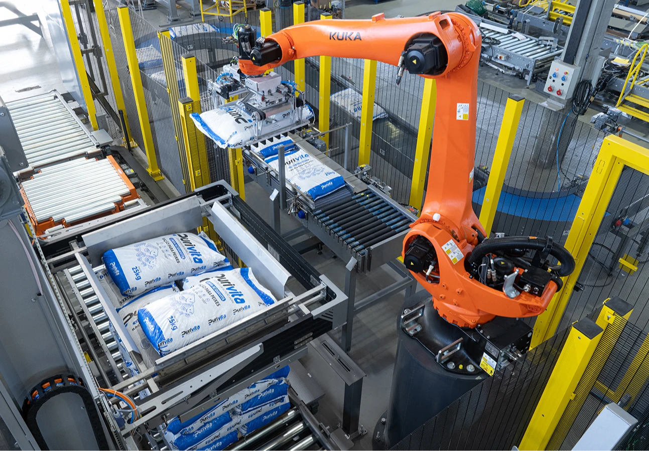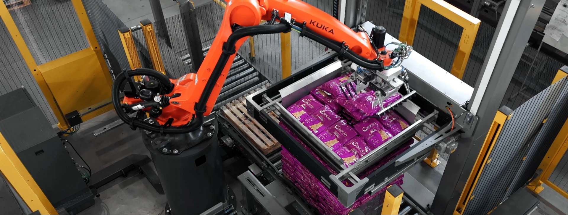 A célula de Paletização de Sacos Sanmartin é responsável por paletizar produtos embalados em sacos (Ex.: sacos de rações). Através de um cabeçote com alta tecnologia, conseguimos entregar agilidade e precisão na formação de camadas, preservando a qualidade das embalagens e maximizando a produtividade. Além disso, a célula é construída com o propósito de entregar maior performance com a menor utilização do espaço fabril.